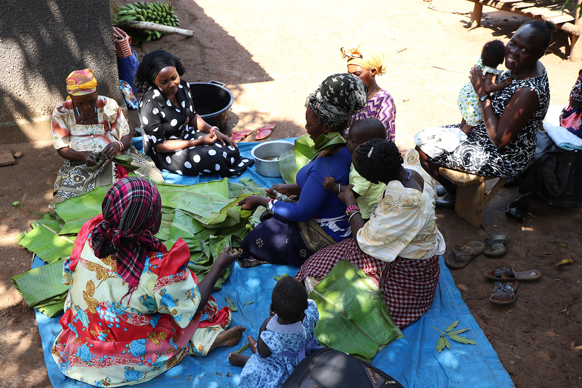 Naluwu (top center) and Unbound Programs Coordinator Christine Naluyima (top right, holding child) meet with a group of mothers in Uganda to talk about their progress in the sponsorship program. Unbound Kampala staff often help mothers with their chores during home visits, such as in the above photo where they are preparing banana leaves for a meal.
